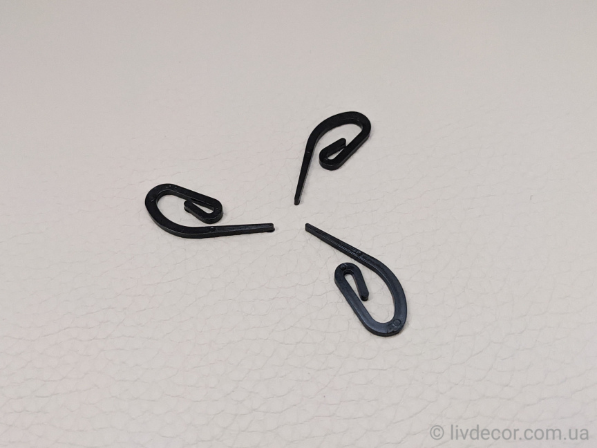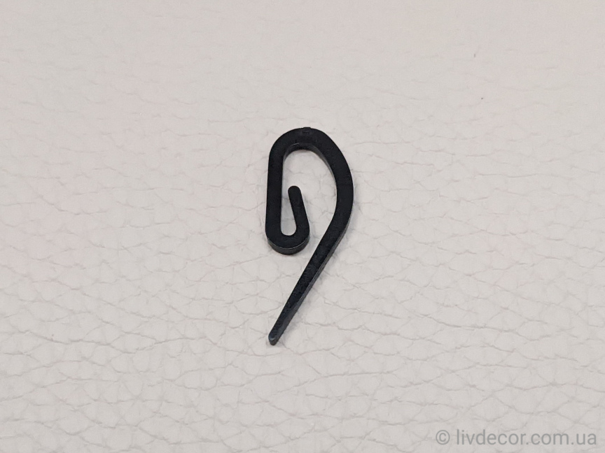 Гачок пластиковий «сігма»( «французький») чорний використовується для штор на шторній стрічці. Гачок вставляється в бігунок профільних карнизів. Особлива форма гачка надає надійну і міцну фіксацію штори. Для цього достатньо просунути «хвостик» гачка в кишеньку тасьми і зафіксувати. Стандартний розрахунок необхідної кількості гачків – 1шт на кожні 10см.